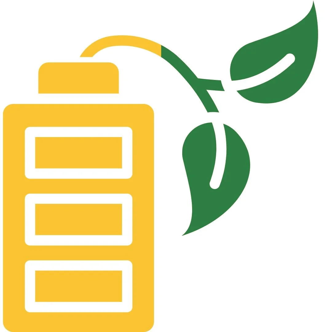 Illustration of a yellow battery with green leaves, symbolizing eco-friendly or renewable energy.